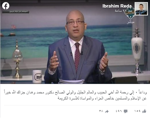 ونعى الشيخ إبراهيم رضا، أحد علماء الأزهر، عبر صفحته الشخصية على موقع التواصل الاجتماعى فيسبوك، الدكتور محمد وهدان. وقال وهدان في تدوينة له عبر حسابه الخاص بـفيس. .لما في المسند وسنن الترمذي وسنن أبي داود أن النبي صلى الله عليه وسلم قال: مولانا جلالالدین محمد بلخی مولوی. علي محمد الصلابي عالم دين ومؤرّخ ليبي، حصل على درجة الإجازة العالمية (الليسانس) من كلية الدعوة وأصول الدين من جامعة المدينة المنورة.