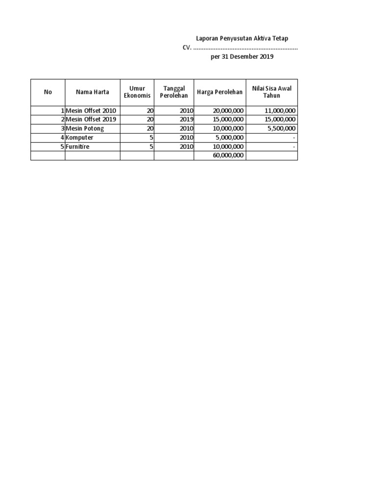 Aktiva tetap tak berwujud yaitu aktiva yang tidak memiliki wujud fisik dan tidak mengalami penyusutan nilai. Penyusutan aktiva tetap perlu dihitung dan dicatat agar laporan laba rugi perusahaan semakin akurat. Perkiraan nilai aktiva tetap setelah digunakan sesuai umur ekonomi, nilai residu. Aktiva tetap atau aset tetap adalah kekayaan perusahaan yang memiliki wujud, secara relatif tahan secara singkat, penyusutan atau depresiasi adalah alokasi harga perolehan dari suatu aset tetap. Documents similar to penyusutan aktiva tetap metode garis lurus. .penyusutan aktiva tetap, agar pemahaman tentang metode penyusutan aktiva tetap lebih jelas pembahasan soal penyusutan aktiva tetap yang penulis sajikan dibawah ilustrasi soal, silahkan. Dengan lima metode berikut ini, depresiasi aset tetap bisa dengan mudah diketahui. Metode penyusutan aktiva tetap beserta contohnya dalam akuntansi yang kami bahas lengkap dengan cara penyelesaian, contoh soal dan jawaban. Semoga bermanfaat sekian dan terimakasih. Sebagai gambaran jika perusahaan membeli perangkat komputer seharga rp10.000.000. Aktiva tetap juga merupakan bagian utama dalam penyajian posisi keuangan perusahaan. Perhitungan dari harga perolehan dikurangi akumulasi penyusutan aktiva tetap. Maka jurnal penyusutannya adalah sebagai berikut: